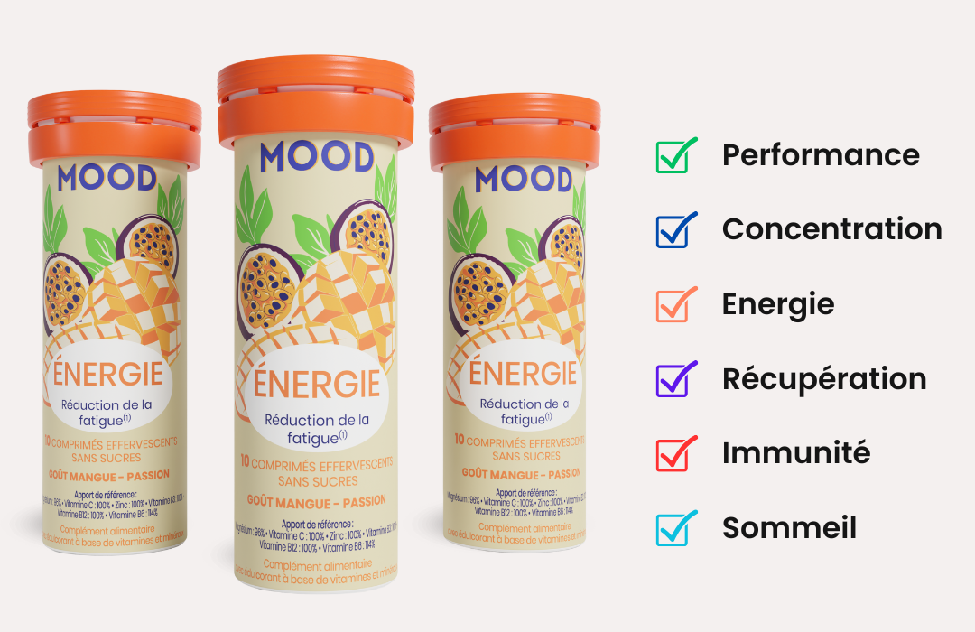 “J’ai commencé Mood il y a un mois et je vois déjà les effets ! Plus d’énergie dès le matin, moins de coup de fatigue en journée, et une meilleure concentration. En plus, la prise est super simple avec la pastille effervescente. Je recommande vraiment à 100 % !”